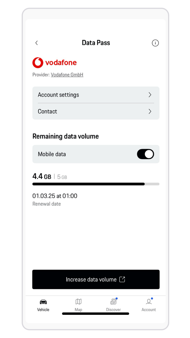Once you have successfully purchased additional data volume, you can check the data volume in the My Porsche app under the Data Pass section. The additional data volume can be used until the end of the coming month.