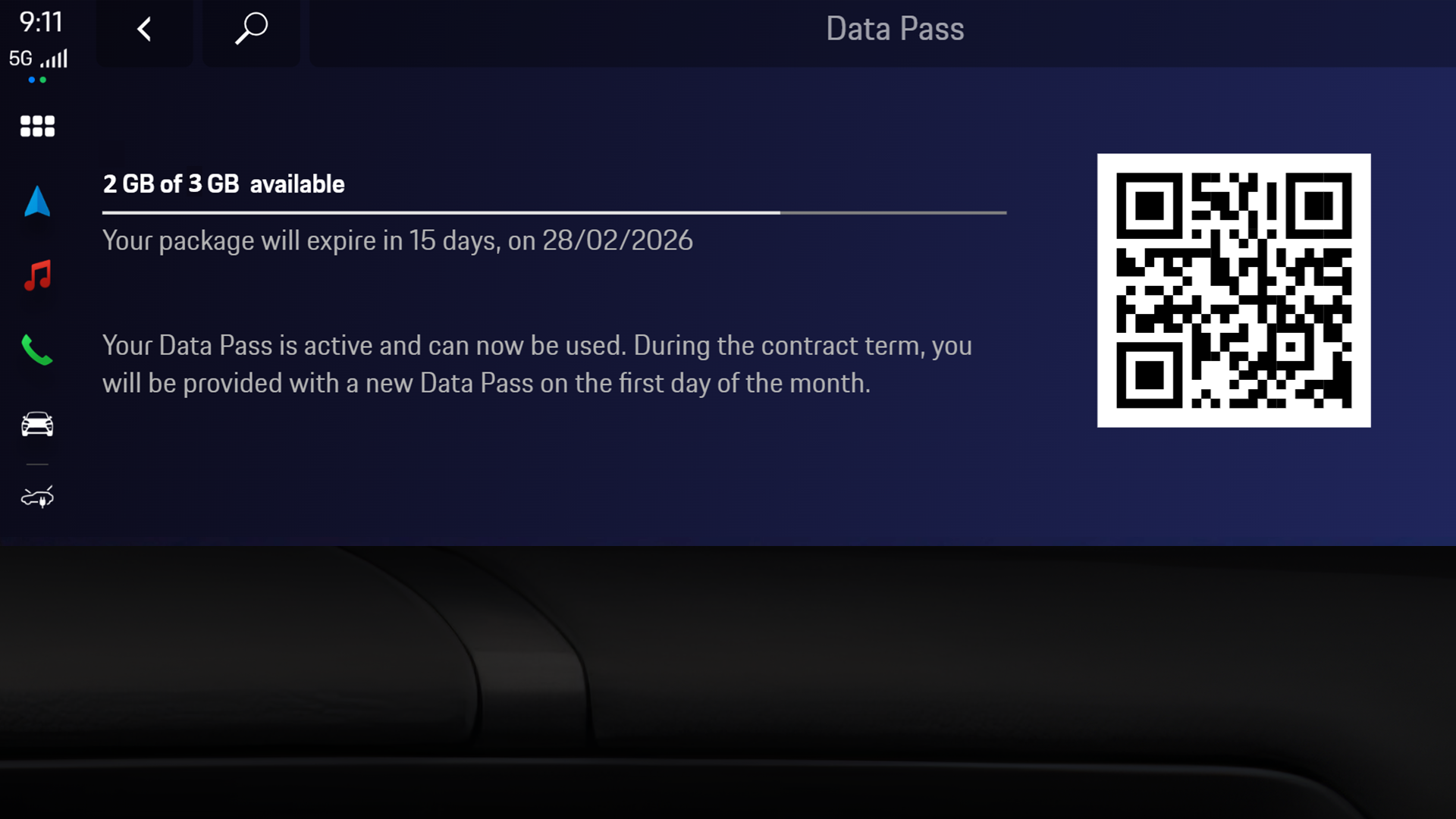 Alternatively, you can start the purchasing process for additional data volume in the PCM by accessing Settings > Data Pass > scan QR code with your mobile phone > You will be redirected to the provider portal for the purchase. Please follow the instructions there. Please note, the QR code will only be shown if 80% or more data is consumed.
