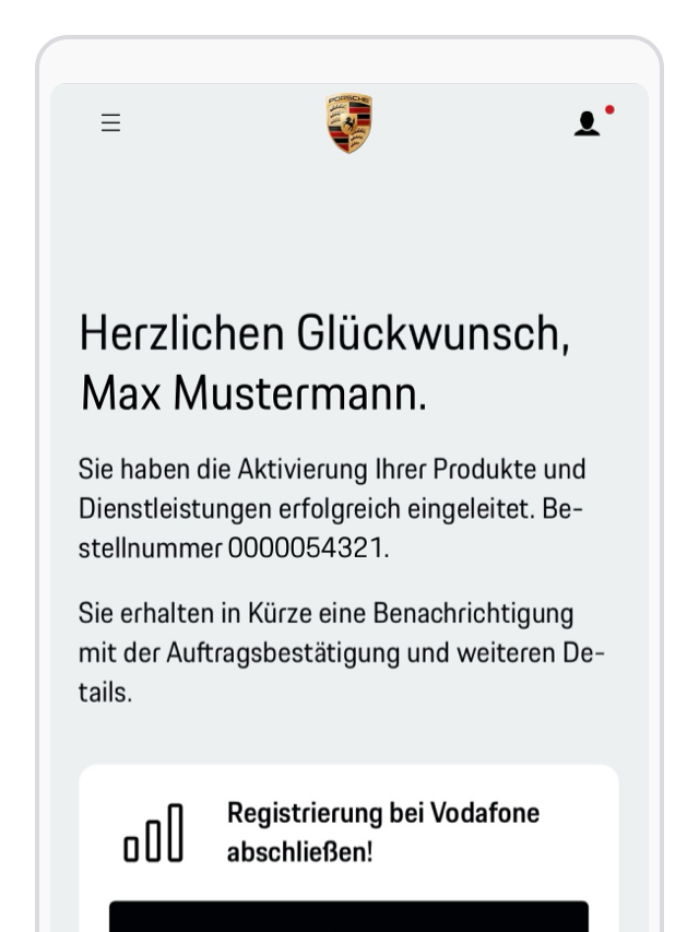 Beginnen Sie mit der Aktivierung der Porsche Connect Dienste. Stellen Sie während dieses Prozesses sicher, dass Sie die Allgemeinen Geschäftsbedingungen akzeptieren und der Datenübertragung an den Netzbetreiber zustimmen. Nach der Aktivierung werden bestimmte Kundeninformationsdaten aus der Porsche ID sicher an den Netzbetreiber übertragen.