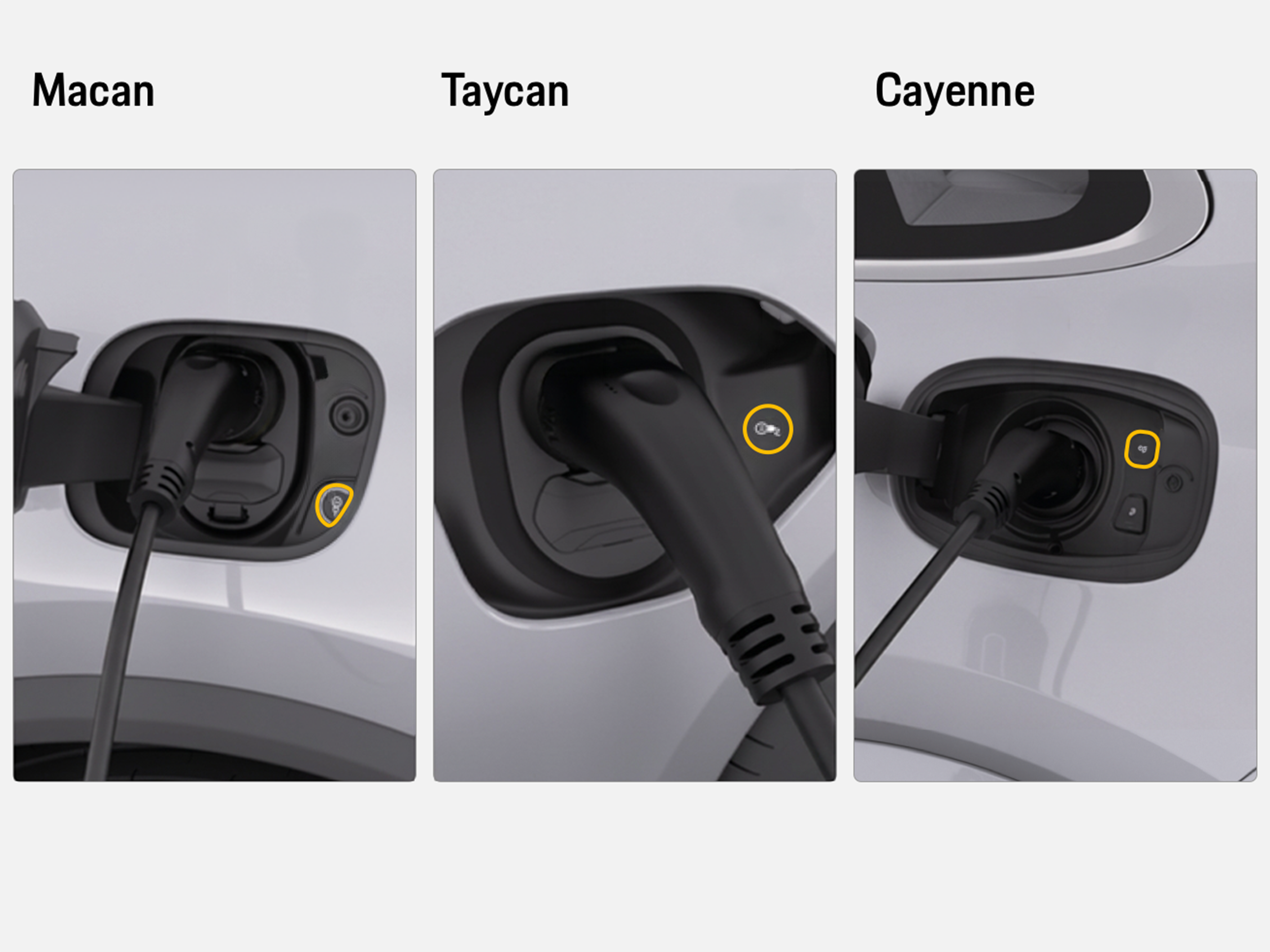 Die folgenden Abbildungen zeigen Ihnen, wo sich die Ladeanschlüsse beim Macan Electric, Cayenne Electric und Taycan befinden. Tipp: Bitte schauen Sie bei Bedarf auch in die Bedienungsanleitung Ihres Fahrzeugs . Dort finden Sie modellabhängig weitere Details.