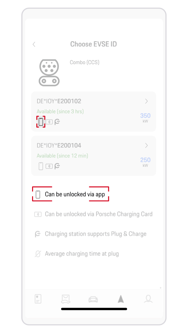 Your My Porsche app will be able to tell you whether a particular charging station supports Plug & Charge. Open the My Porsche app on your phone > Tap Map (navigation arrow in the bottom navigation bar) and enter your location > Tap Show charging stations (at the top of the map) > filter the map view to only see chargers that offer Plug & Charge.