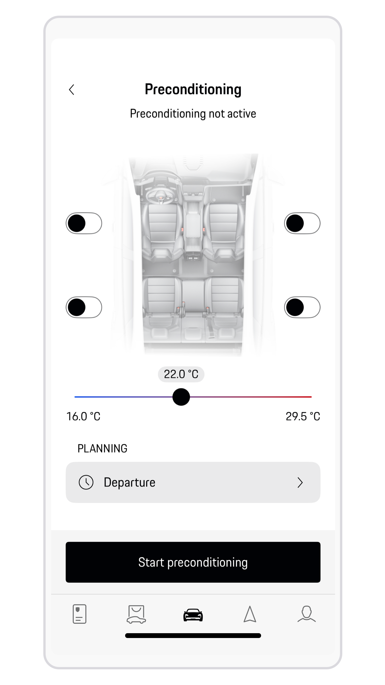 You can also set a departure timer to precondition your car for your planned departure time which is recommended from an energy-saving perspective. Your car automatically wakes up before your planned departure, checks the current cabin conditions and what the desired state should be. Then it determines the time required and controls the heating and cooling process intelligently and based on demand, with no manual preselection required by you. For instance, on a sunny winter day, not every heating function, such as glass surfaces, is activated if unnecessary, to minimise energy loss. This also means it doesn't necessarily take 30 or 60 minutes, but only as long as needed to reach the desired temperature.