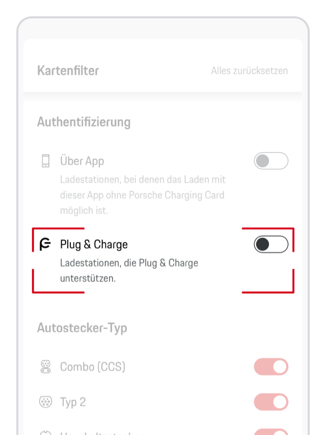Sie können auch einen Filter in der Kartenansicht der My Porsche App setzen, um nur Ladestationen anzuzeigen, die Plug & Charge anbieten. Diese Liste wird vom Porsche Charging Service verwaltet.