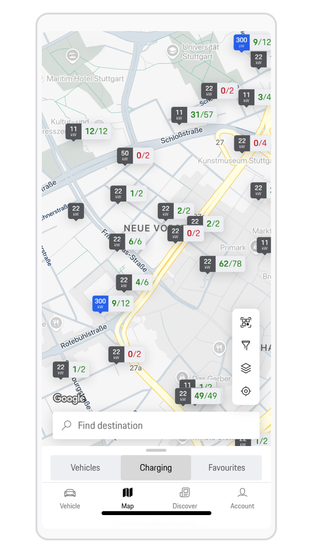 Se todas as estações de carregamento indicarem "fora de serviço", esta localização não será apresentada na aplicação My Porsche. As alternativas são imediatamente visíveis no mapa.